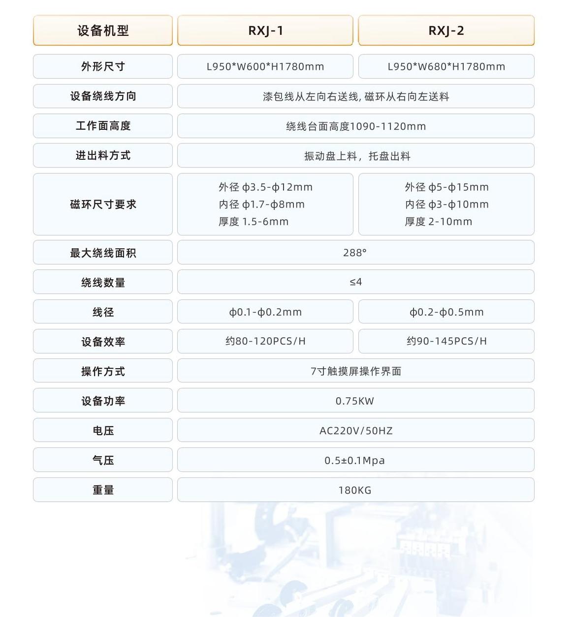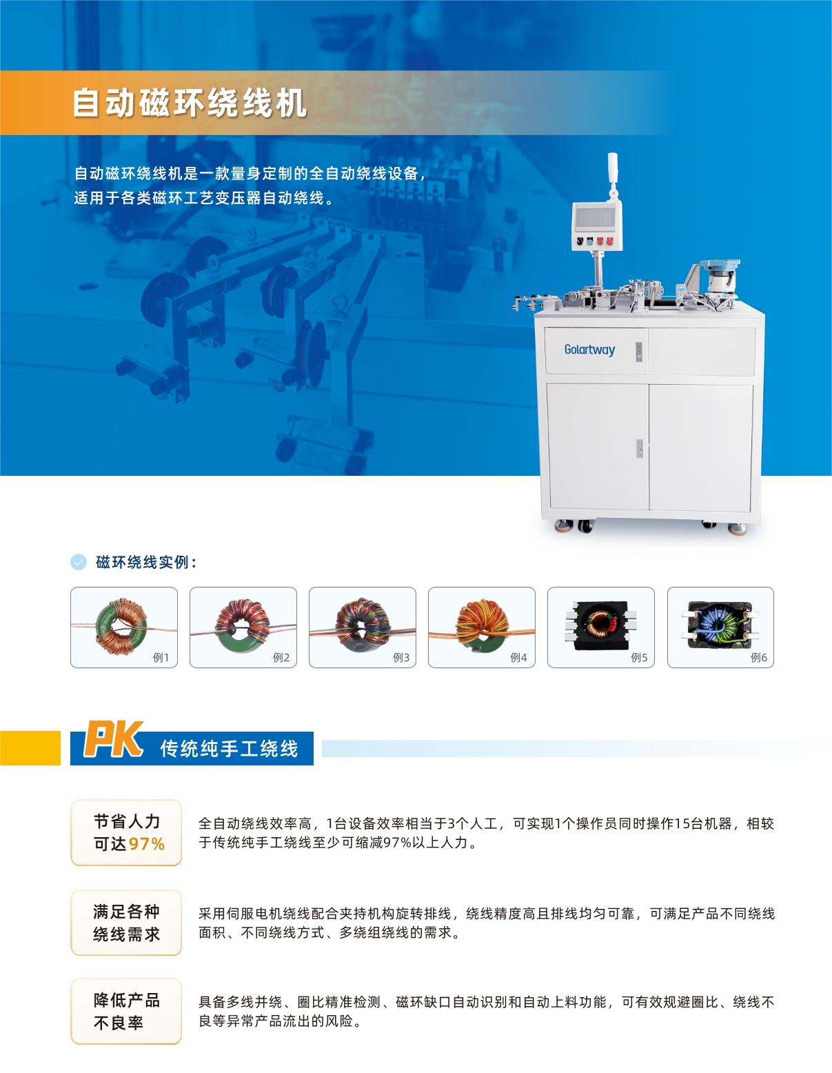 ▶ 适用于各类磁环、工艺变压器自动绕线 ▶ 采用振动盘自动供料 ▶ 伺服电机储线/绕线,配合夹持壁旋转排线,绕线精度高 ▶ 智能自动绕线技术和磁环上料检测功能、专利技术组合,保证产品符合工艺要求 ▶ 可实现1人操作10机,相较于传统纯手工绕线可缩减90%以上人力 ▶ 特别适合于定压、共模等电源变压器产品